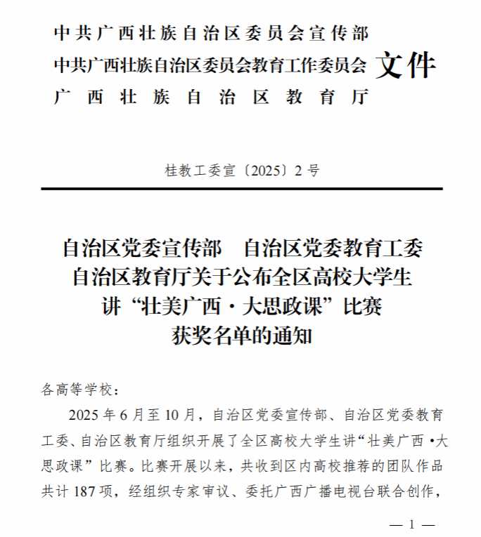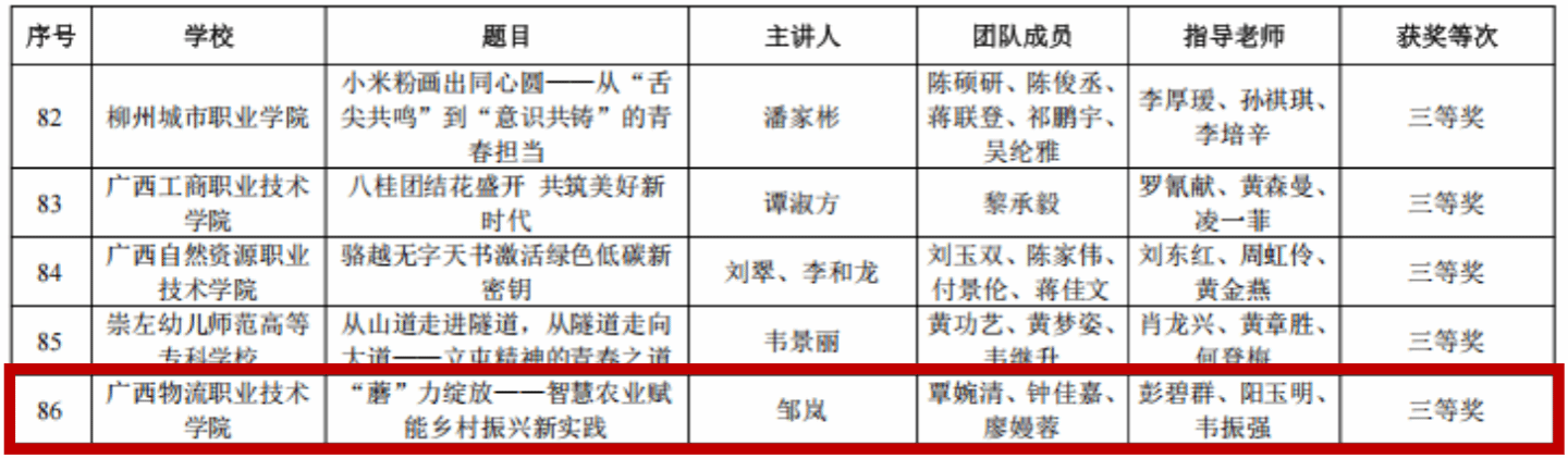 2025年11月26日,我院教师彭碧群、阳玉明、韦振强共同指导学生作品《“蘑”力绽放——智慧农业赋能乡村振兴新实践》获全区高校大学生讲“壮美广西·大思政课”比赛三等奖。(主讲人:邹岚;团队成员:覃婉清、钟佳嘉、廖嫚蓉)