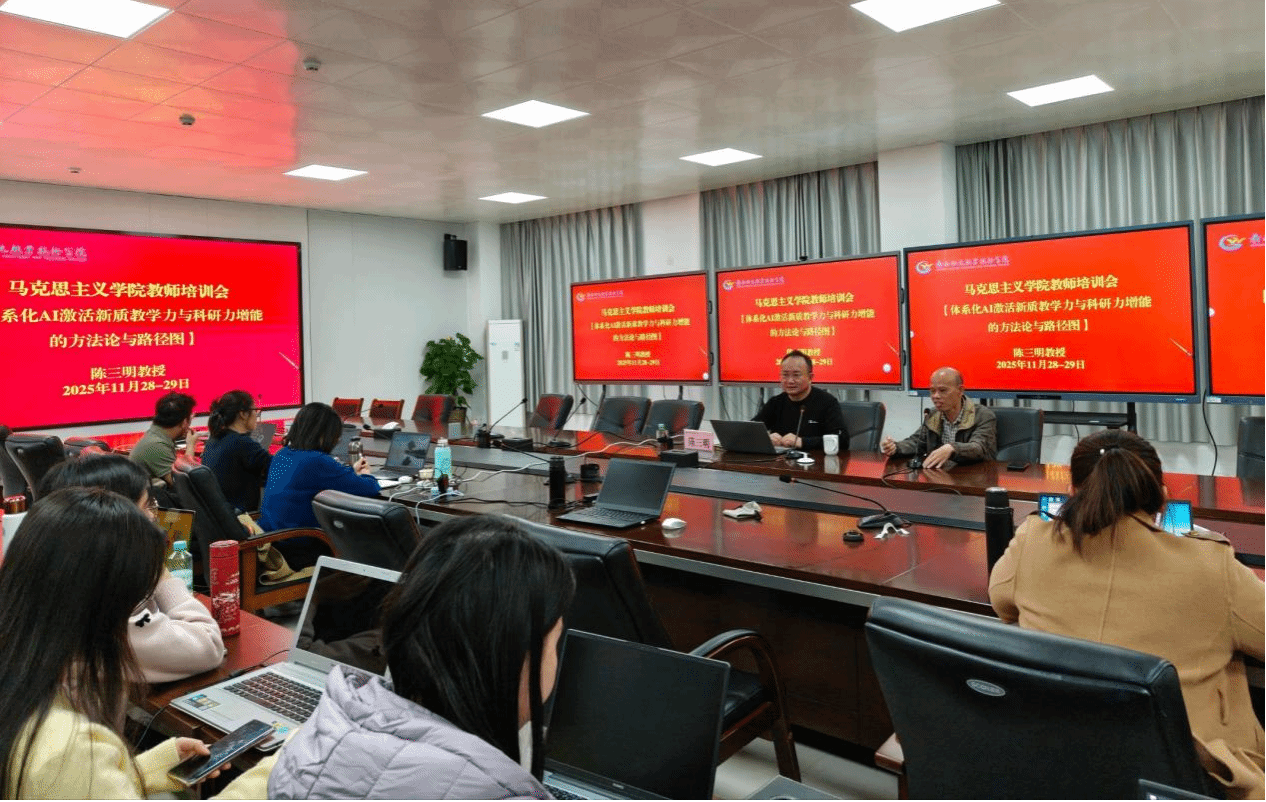 11月28至29日,马克思主义学院在独秀南楼401会议室举办“教师发展·双翼升维:体系化AI激活新质教学力与科研力增能的方法论与路径图”专题培训。本次培训特邀桂林航天工业学院领航学者、教育部教育管理信息中心“全国教师信息技术培训(TITT)”特聘讲师陈三明教授担任主讲,由学院副院长蓝海南主持,马克思主义学院全体思政课教师参加培训。