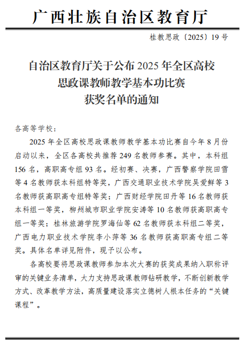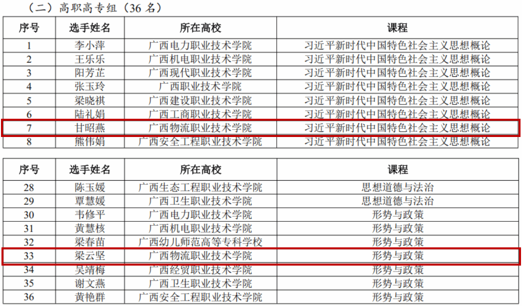 近日,自治区教育厅公布了全区高校思政课教师教学基本功比赛获奖名单的通知,马克思主义学院教师甘昭燕、梁云坚分别荣获高职高专组“习近平新时代中国特色社会主义思想概论”课程和“形势与政策”课程二等奖。
