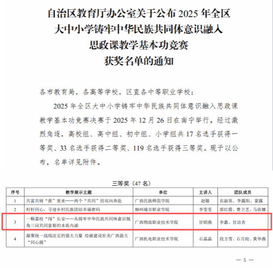 近日,2025年全区大中小学铸牢中华民族共同体意识融入思政课教学基本功竞赛结果揭晓。马克思主义学院(下文简称“马院”)甘昭燕老师主讲,李惠、甘洁杏老师组成的团队的作品《一颗荔枝“闯”长安——从铸牢中华民族共同体意识视角三问共同富裕的本质内涵》,在全区多所本专科院校参赛队伍的激烈角逐中脱颖而出,荣获高校组三等奖。此次获奖不仅为马院思政课教学改革创新添彩,更是马院首次在市厅级微课赛事中斩获荣誉。